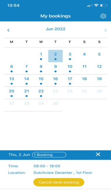 • Reservierungen – verschaffen Sie sich einen Überblick über alle von Ihnen vorgenommenen Reservierungen. Ist unter einem Datum ein Punkt eingeblendet, haben Sie am betreffenden Tag einen Arbeitsplatz reserviert. Nach dem Anklicken eines solchen Datums erscheint ein Pop-up-Fenster mit Angaben zu Uhrzeit, Ort und Etage für diese Reservierung. Sie haben dann auch die Möglichkeit, die Reservierung zu stornieren. Wenn Sie die Uhrzeit anklicken, werden Sie zu dem von Ihnen reservierten Arbeitsplatz geleitet.