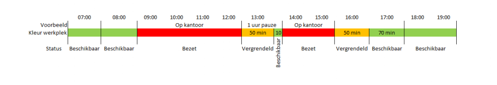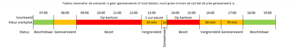 - Mitarbeiter reserviert einen Arbeitsplatz von 8:00 bis 18:00 Uhr - Ist ab 9:00 Uhr im Büro - Macht 1 Stunde Pause von 13:00 bis 14:00 Uhr - Nimmt den Arbeitsplatz ab 14:00 Uhr wieder ein - Ist ab 16:00 Uhr nicht mehr im Büro - Reservierung endet um 18:00 Uhr
